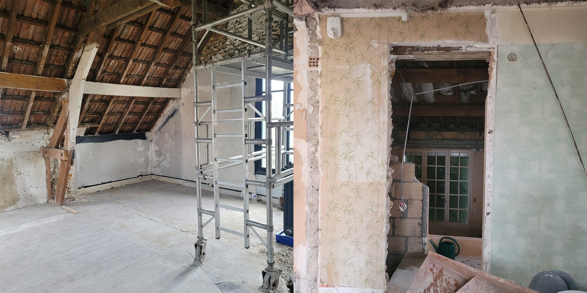 The renovation began by stripping the house back to its core, exposing the strength of its sandstone walls and the timber beams that define the upper floor. With the removal of partitions, the opening of ceilings, and the reconnection of the former atelier to the main house, the spaces were reimagined as a harmonious sequence — open, fluid, and bathed in natural light.